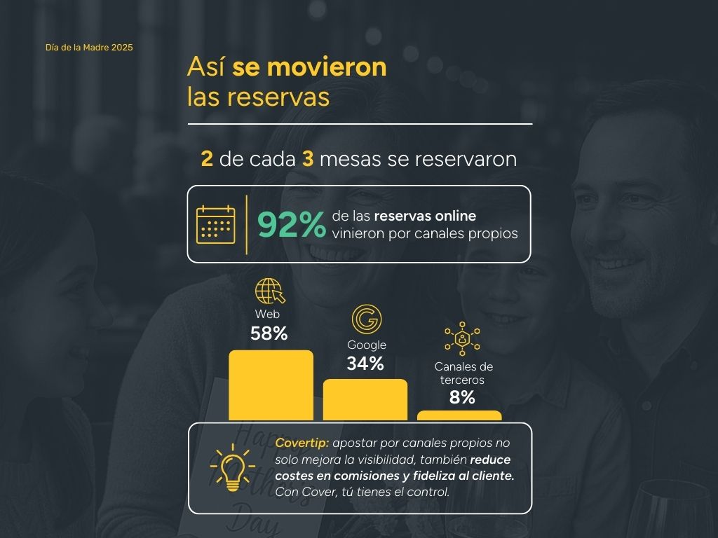 - Potencia el canal directo: la mayoría de reservas llega por la web del restaurante o Google. Enfoca tus esfuerzos en estos canales propios para maximizar tus resultados.
